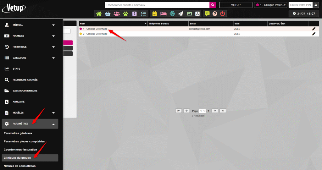 Cliquez sur votre clinique (ou sur celle que vous souhaitez modifier en cas de multiclinique).