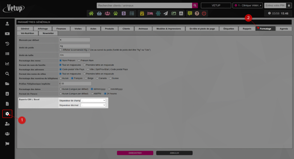 Vetup vous permet de personnaliser le séparateur de colonnes et le séparateur décimal utilisés dans les fichiers CSV. Ce paramétrage est essentiel pour garantir une lecture correcte de vos exports dans le logiciel tableur utilisé en clinique (Excel, LibreOffice, Google Sheets, etc.).