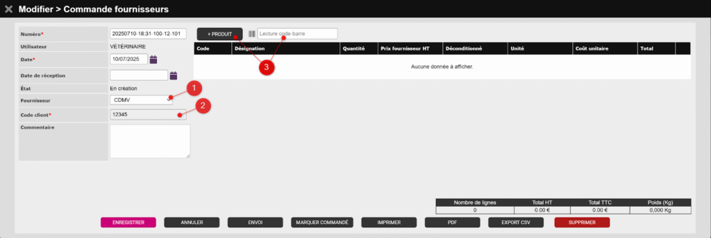Ajoutez ensuite des produits à votre commande (3) en cliquant sur le bouton + PRODUIT, ou en utilisant le champ Lecture code-barre si vous travaillez avec une douchette (voir tutoriel dédié).