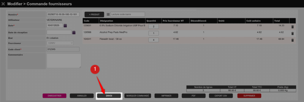 Une fois tous les produits ajoutés à votre commande, cliquez sur le bouton ENVOI (1) pour la transmettre directement à CDMV.