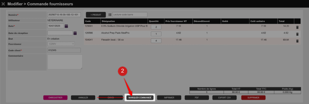 Revenez ensuite dans Vetup et cliquez sur le bouton Marquer commandé (2).