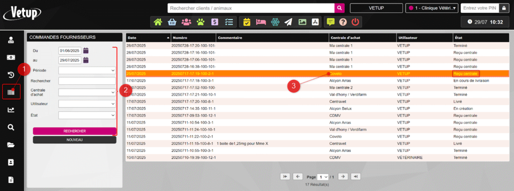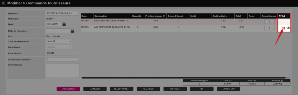 Vous avez passé une commande Coveto via Vetup et elle vient d’être livrée à la clinique. Il faut maintenant réceptionner cette commande pour que les produits soient ajoutés au stock. Cette opération est essentielle, pour le suivi de votre stock et vos registres, notamment pour les produits soumis à la gestion de lots.