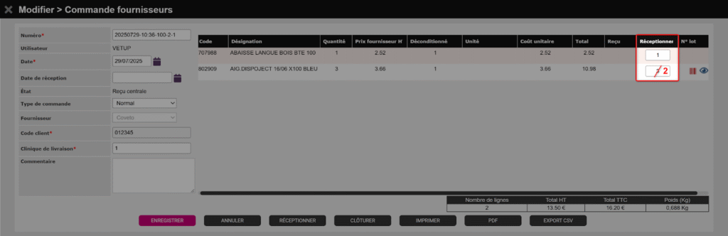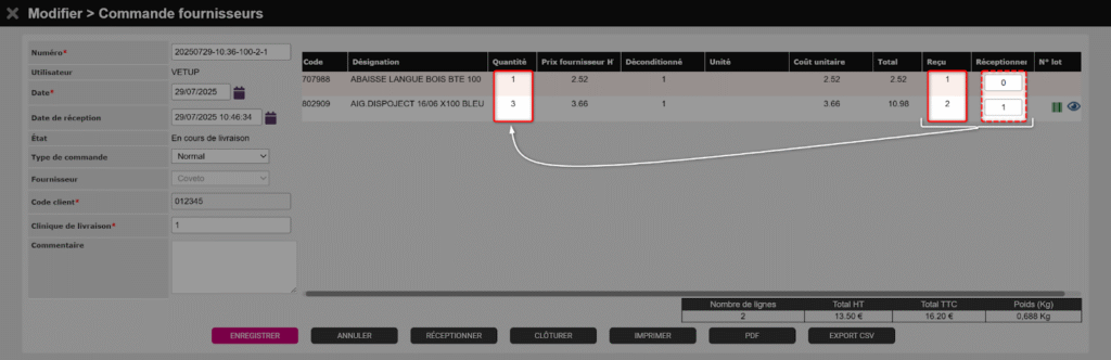 Corrigez les quantités de la colonne Réceptionner si vous avez reçu moins que prévu. Aidez-vous du bon de livraison papier joint à votre commande pour identifier les reliquats.