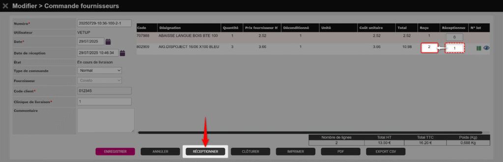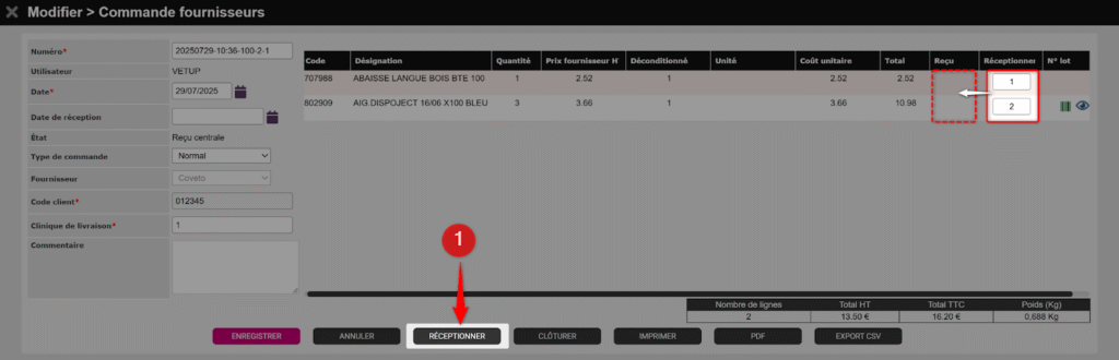 Les quantités de la colonne Réceptionner sont ajoutées au stock Vetup.