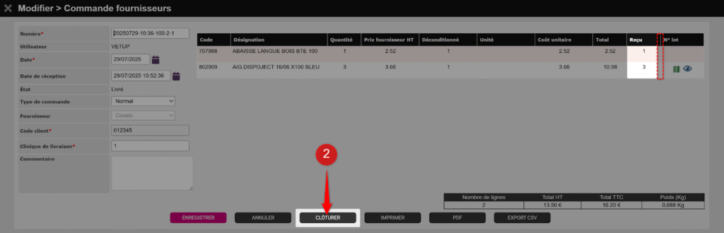 Une fois la commande clôturée, plus aucun élément ne pourra être modifié : vous ne pourrez plus réceptionner de reliquat(s), ni ajuster les quantités ou les lots.