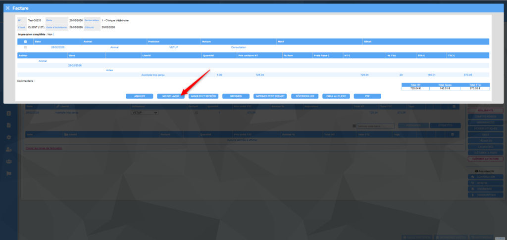Toujours depuis la visite A, cliquez sur le bouton FACTURE puis sur NOUVEL AVOIR.