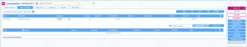 Cependant, il peut arriver qu’un acompte soit enregistré et que le propriétaire annule la chirurgie prévue, par exemple. Dans ce cas le montant de la facture finale est supérieur au montant de l’acompte effectué.