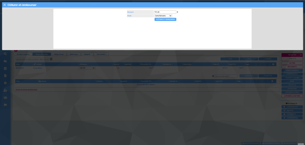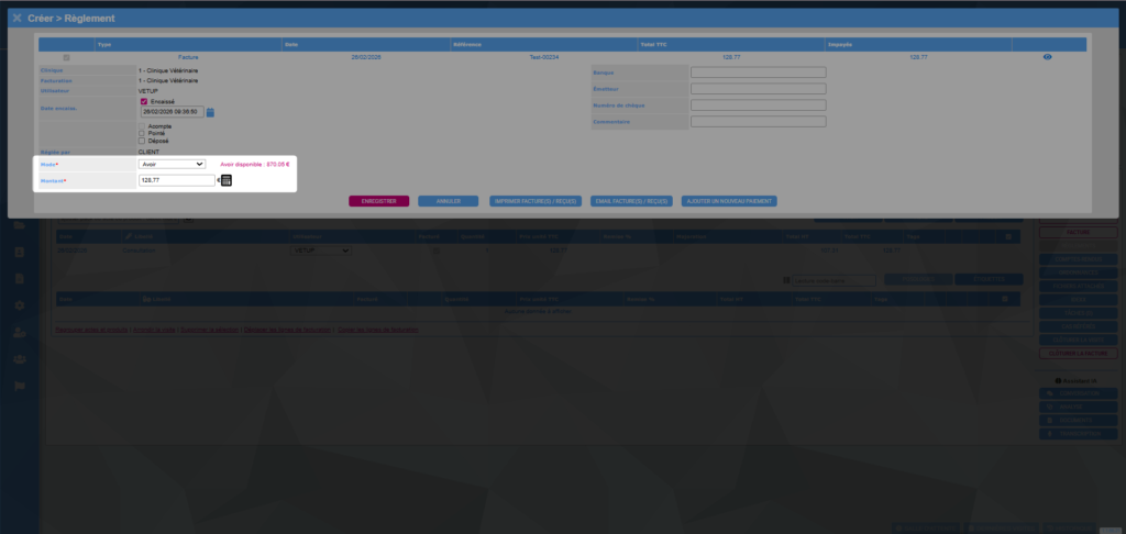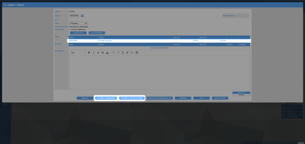 Exemple : votre client effectue un acompte de 870,05€ pour une chirurgie. Ce dernier décide de l’annuler, la facture finale est maintenant de 128,77€. Le client souhaite être remboursé du trop-perçu.