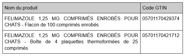Dans cet exemple, bien que le produit (FELIMAZOLE 1,25 MG) soit identique, les deux codes GTIN diffèrent car ils sont liés à des conditionnements de comprimés distincts (flacon ou boîte de plaquettes).
