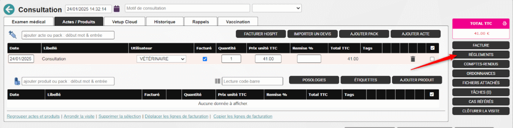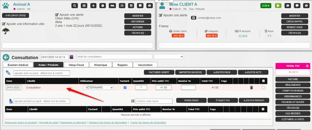 Depuis une consultation ou une vente, saisissez les actes et/ou produits souhaités.