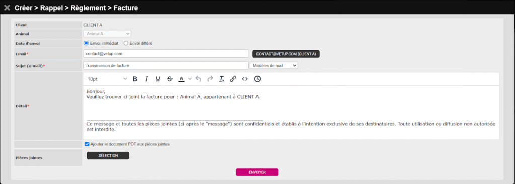 Si vous avez choisi de cliquer sur le bouton EMAIL FACTURE, la page suivante s’affichera comme suit. Il vous suffit alors de cliquer sur le bouton ENVOYER, la facture sera envoyée au client et le règlement sera enregistré.