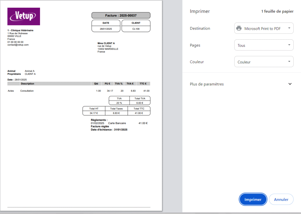 Si vous avez choisi de cliquer sur le bouton IMPRIMER FACTURE, la page suivante s’affiche comme suit : il vous suffit de cliquer sur le bouton Imprimer. La facture s’imprimera et le règlement sera enregistré.