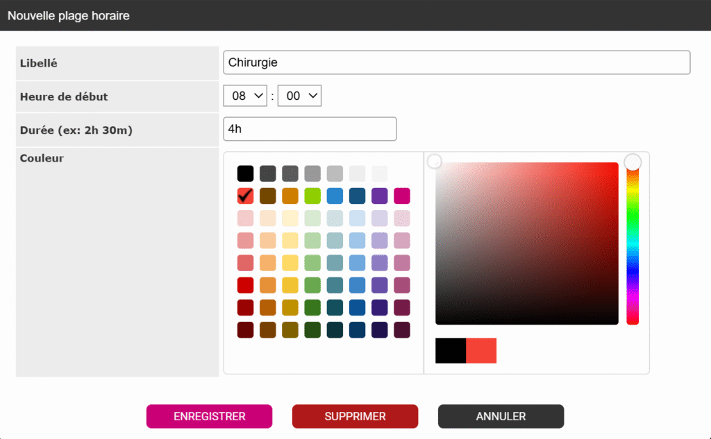 Ici, vous allez pouvoir indiquer le Libellé, l’Heure de début, la Durée de l’activité ainsi que lui associer une Couleur.