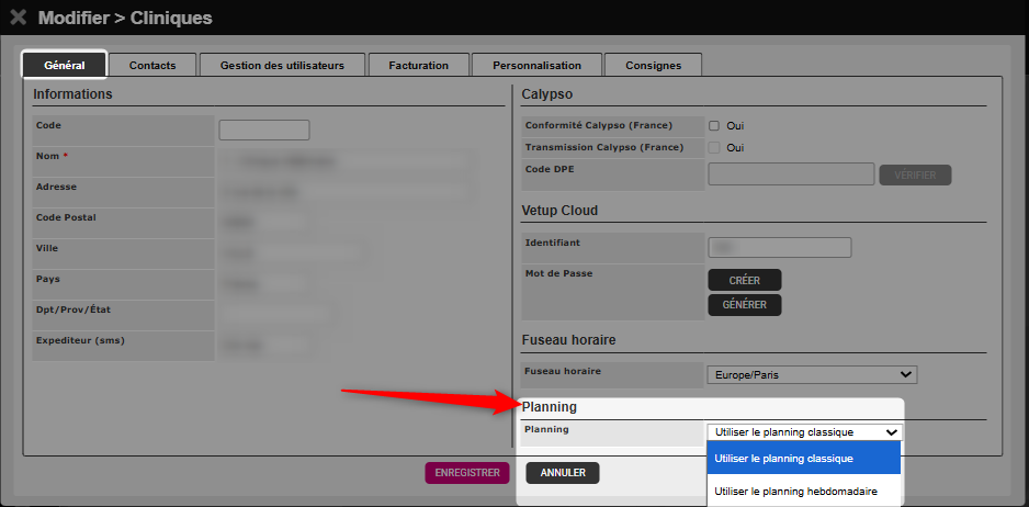 Dans l’onglet GENERAL vous pouvez choisir le planning que vous voulez utiliser. Puis cliquez sur ENREGISTRER.